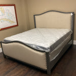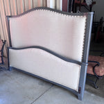 headboard, footboard, gray side rails, 5 light wood slats with feet, hardware
