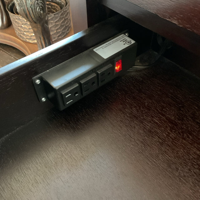 23"W X 19"D X 26"H, One nightstand has a power strip in the drawer