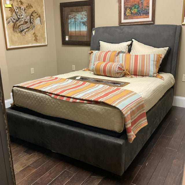headboard, footboard, 2 upholstered side rails, 3 brown metal slats with feet